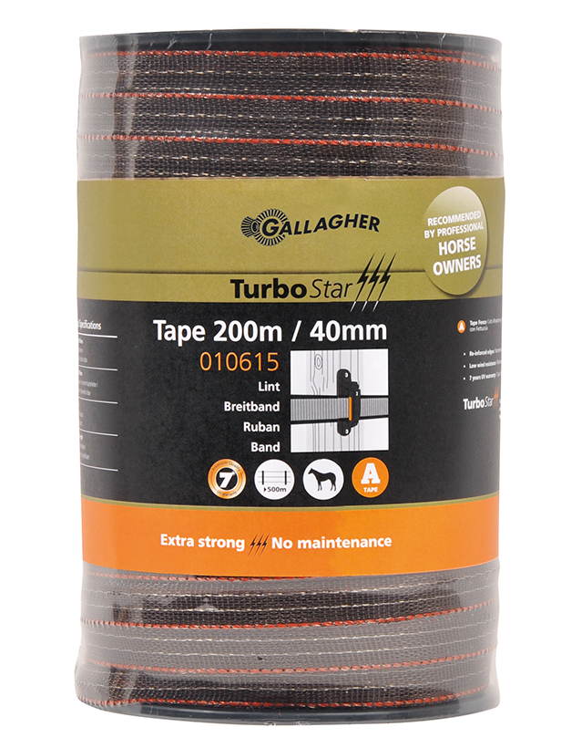 | TurboStar Tape is a premium 40mm tape which has the lowest resistance available today. It has a 40 times better conduction than regular tape and will result in more power on your fence due to 11 stainless steel wires and 4 mixed metal wires. Post spacing up to 6m. The sturdy and breathable features prevent tensioning regularly. Available in green, terra and white on 200m rolls. | ||||||||||||||||||||||||||||||||||