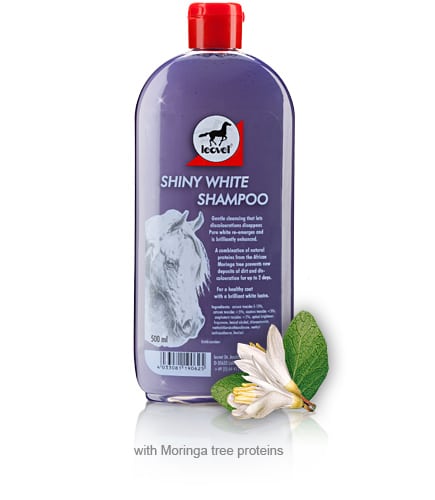 Body culture for white horses. Gentle cleansing that lets discolourations disappear. Pure white re-emerges and is brilliantly enhanced. A combination of natural proteins from the moringa tree prevent new deposits of dirt and discolouration for up to two days. For a healthy coat with a brilliant white lustre.