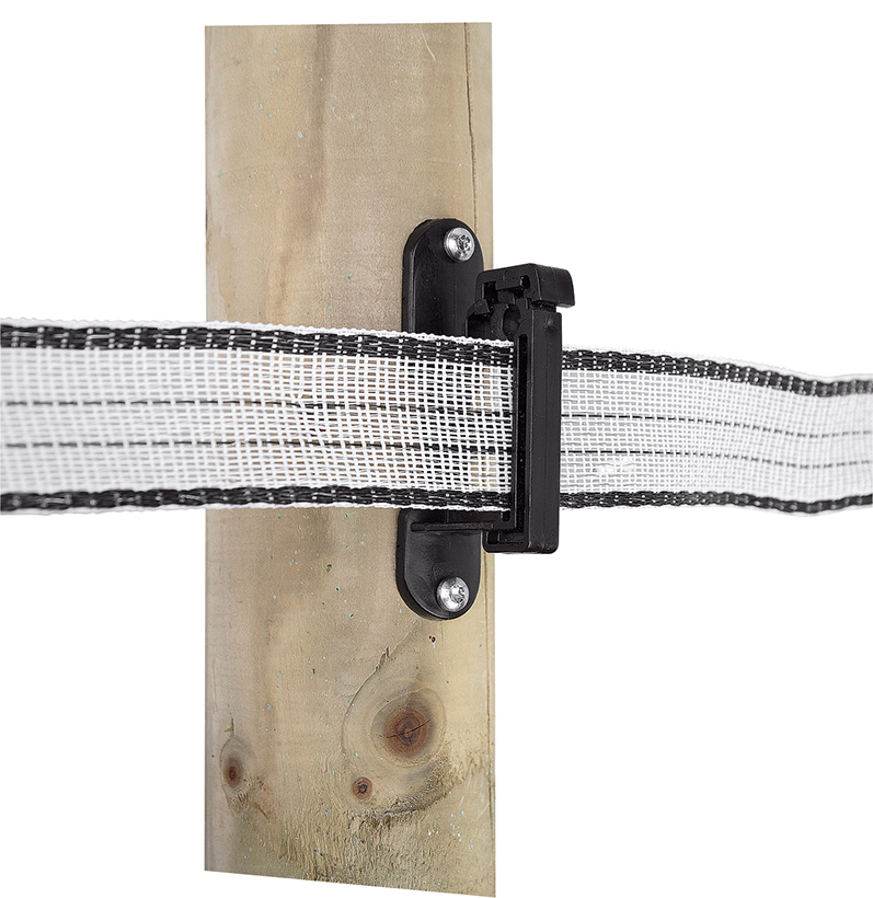 An easy to use insulator that attaches 20mm and 40mm tape to wooden post permanent fences.